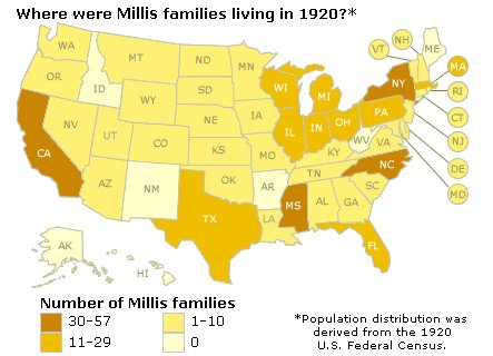 Distribution of Millis families in the US in 1920 (via Ancestry.com - 1920 US Federal Census)